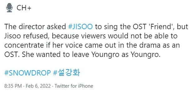 เมื่อวันที่ 6 กุมภาพันธ์ จีซู BLACKPINK ได้ออกอากาศสดด้วยเสียงเพื่อพูดคุยกับแฟนๆ ไอดอลหญิงเซอร์ไพรส์แฟนๆ เมื่อเธอเปิดเผยว่าเธอถูกขอให้ร้องเพลง “FRIEND” สำหรับประกอบละครเรื่อง “Snowdrop” อย่างไรก็ตาม จีซูปฏิเสธเพราะเธอคิดว่าถ้าเสียงของเธอออกมาในละคร มันจะทำให้ผู้ชมเสียสมาธิและพวกเขาจะไม่สามารถมีสมาธิกับละครได้ จีซูเสริมว่าเธอต้องการให้ทุกคนโฟกัสที่ยองโร ตัวละครของเธอ ไม่ใช่จีซู BLACKPINK และผู้กำกับก็เคารพความคิดเห็นของเธอ
