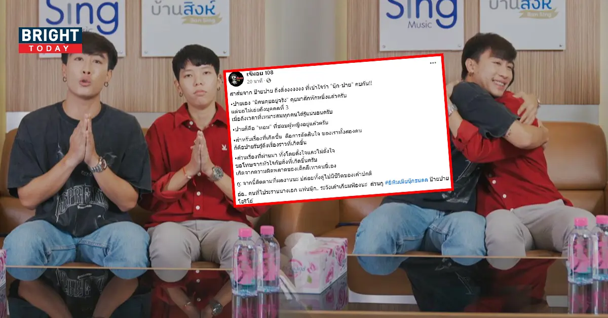 เรียกว่ากลายเป็นกระแสดราม่าหนักสำหรับประเด็นลดสถานะคู่จิ้นของ นุ๊ก ธนดล และ ป๊ายปาย ฉัตรนภา ที่ทั้งคู่ตัดสินใจลดสถานะเป็นเพื่อนกัน พร้อมแถลงข่าวไปแล้วเมื่อวันที่ 17 พฤษภาคมที่ผ่านมา ล่าสุดเพจดังอย่างเจ๊มอย108 ได้ออกมาโพสต์ว่า สาส์นจาก ป๊ายปาย ถึงติ่งงงงงงง ที่เข้าใจว่า “นุ๊ก-ปาย” คบกัน!!