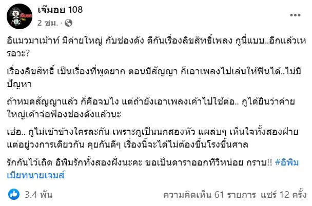 ขาเผือกทำงานไม่เว้นวันหยุดหลังเพจดังอย่าง เจ๊มอย108 ออกมาเปิดประเด็นใหม่บอกว่า มีค่ายใหญ่ กับช่องดัง ตีกันเรื่องลิขสิทธิ์เพลง กูนี่แบบ..อีกแล้วเหรอวะ?