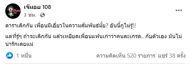 เจ๊มอย108 ทิ้งระเบิด แฉอดีตคู่รักคนดัง เลิกรากันแล้ว แต่อีกฝ่ายเหยียดอดีตคนรัก ว่าคนละเกรดกับตัวเอง งานนี้เพื่อนเอี่ยวมั้ย ไม่รู้ แต่แบบนี้ไม่น่ารักเลย พวกเน็ตแห่เดา มีไม่กี่คู่!