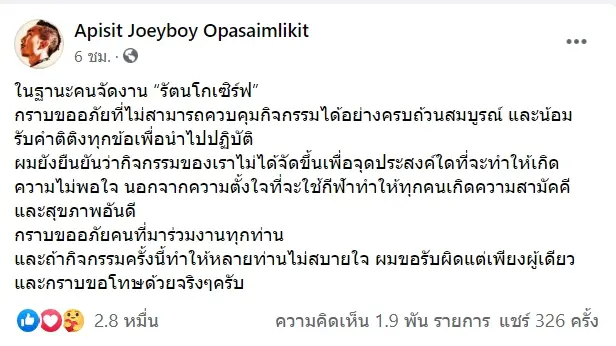 “กราบขออภัยคนที่มาร่วมงานทุกท่านและถ้ากิจกรรมครั้งนี้ทำให้หลายท่านไม่สบายใจ ผมขอรับผิดแต่เพียงผู้เดียวและกราบขอโทษด้วยจริงๆ ครับ””