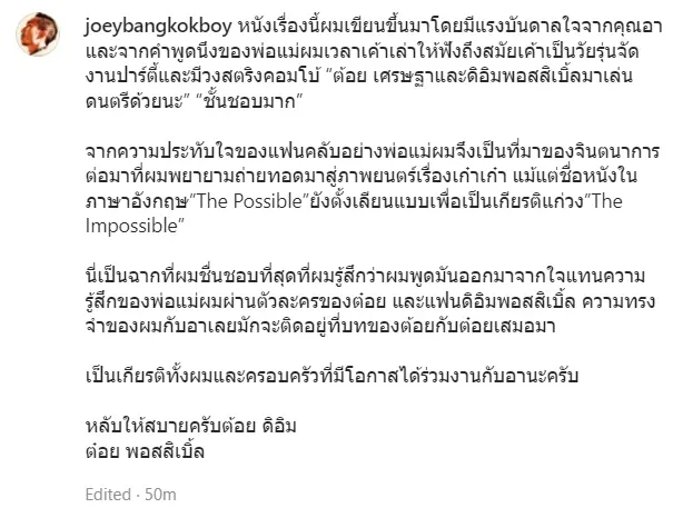 โจอี้ บอย ออกมาร่ายโพสต์ยาวถึง อาต้อย เศรษฐา หลังร่วมแสดงผลงานกันในภาพยนตร์ดัง ทั้งยังเผยอีกว่า พ่อแม่ตนก็ยังชื่นชอบมากอีกด้วย