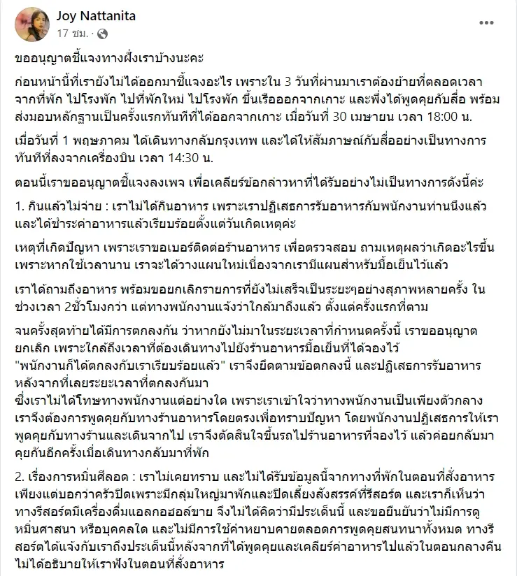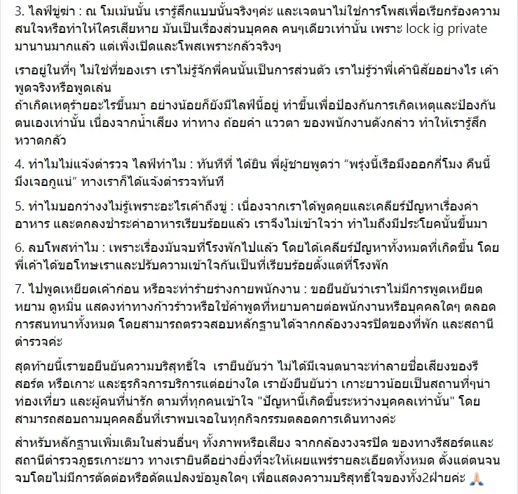 โดยทางด้านของ จอย เองก็ได้โพสต์อธิบายข้อสงสัยอื่น ๆ ที่ยังไม่เคลียร์ชัดในเฟซบุ๊กของตัวเองไว้ยาวเหยียด และตอนนี้เรื่องราวทั้งหมดก็จบลงเรียบร้อยแล้ว มีการพูดคุยกันกับทางคู่กรณี และคู่กรณีก็ได้ทำการขอโทษต่อเหตุการณ์หมด ตัวจอยเองเลยทำการลบโพสต์ที่ไลฟ์สดออกไป ส่วนในเรื่องของหลักฐานต่าง ๆ เจ้าตัวยินดีที่จะนำออกมาเผยแพร่ทั้งหมด ทั้งกล้องวงจรปิดในรีสอร์ทหรือในสถานีตำรวจ ยืนยันว่าไม่ได้มีการพูดจารุนแรง หยาบคาย หรือมีท่าทางที่จะทำร้ายร่างกายพนักงานอย่างแน่นอน