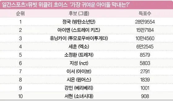 จองกุก BTS เป็นมักเน่ที่น่ารักที่สุดที่ได้รับเลือกจากแฟนๆ โดยได้รับคะแนนโหวตทั้งหมด 289,554 โหวต จากทั้งหมด 634,764 โหวต