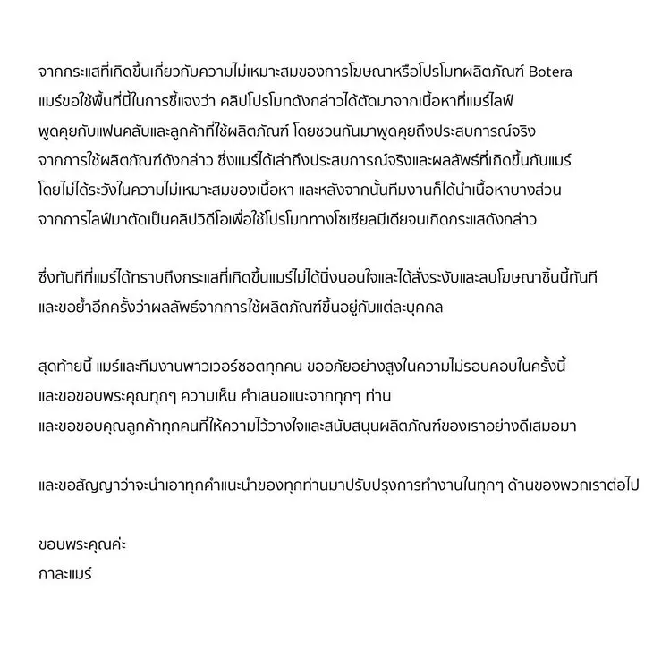 “จากกระแสที่เกิดขึ้นเกี่ยวกับความไม่เหมาะสมของการโฆษณาหรือโปรโมทผลิตภัณฑ์ Botera แมร์ขอใช้พื้นที่นี้ในการชี้แจงว่า คลิปโปรโมทดังกล่าวได้ตัดมาจากเนื้อหาของการไลฟ์ที่แมร์พูดคุยกับแฟนคลับและลูกค้าที่ใช้ผลิตภัณฑ์ที่ชวนกันมาพูดคุยถึงประสบการณ์จริงจากการใช้ผลิตภัณฑ์ดังกล่าว ซึ่งแมร์ได้เล่าถึงประสบการณ์จริงและผลลัพธ์ที่เกิดขึ้นกับแมร์ โดยไม่ทันได้ระวังในความไม่เหมาะสมของเนื้อหาดังกล่าว และหลังจากนั้นทีมงานก็ได้นำเนื้อหาบางส่วนจากการไลฟ์มาตัดเป็นคลิปวิดีโอเพื่อใช้โปรโมททางโซเชียลมีเดียจนเกิดกระแสดังกล่าว
