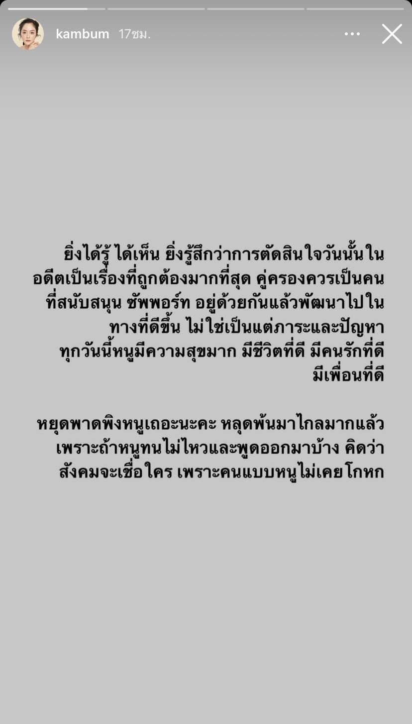 แก้มบุ๋ม ปรียาดา โพสต์สตอรี่ไอจี วอนหยุดพาดพิงตัวเอง หลังอดีตคนรัก ขุน ชานนท์ มีประเด็นดราม่าในโซเชียล ลั่น! วันนั้นตัดสินใจถูกแล้ว ชีวิตทุกวันนี้มีความสุขมาก