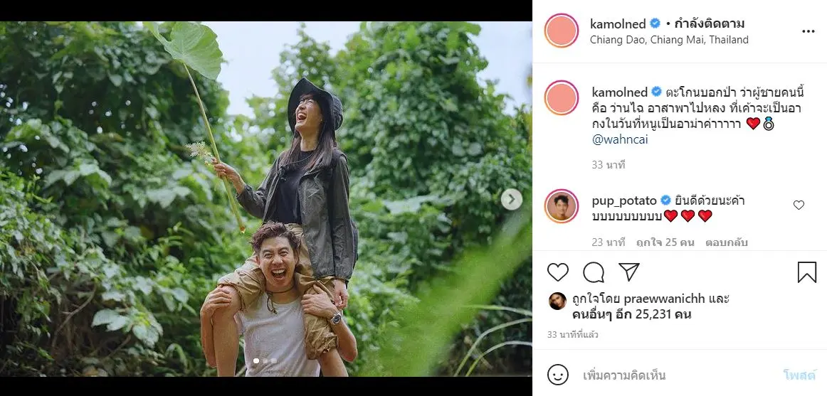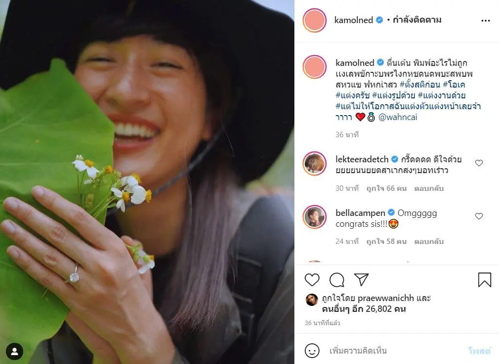 ทำเอาเพื่อนพ้องในวงการบันเทิงเข้ามาร่วมแสดงความยินดีอย่างมากมาย ด้าน อาย กมลเนตร ก็ได้โพสต์ภาพพร้อมข้อความเช่นกัน โดยมีแคปชั่นว่า ตะโกนบอกป่า ว่าผู้ชายคนนี้ คือ ว่านไฉ อาสาพาไปหลง ที่เค้าจะเป็นอากงในวันที่หนูเป็นอาม่าค่าาาาา ❤️💍 @wahncai ทีมข่าว Bright To Day ต้องขอแสดงความยินดีกับความรักในครั้งนี้ด้วยครับ