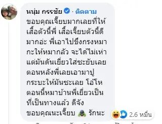 ทันใดนั้นเองด้าน หนุ่ม กรรชัย ก็ไม่ยอมน้อยหน้าโร่เข้ามาคอมเมนต์แบบจัดหนักจนทำเอาคนกดไลค์ไปสองพันกว่าครั้ง พร้อมข้อความว่า ขอบคุณเจี๊ยบมากเลยที่ให้เสื้อตัวนี้พี่ เสื้อเจี๊ยบตัวนี้ดีมากอ่ะ พี่เอาไปขึงกรงหมา กะให้หมากลัว จะได้ไม่เห่า แต่มันดันเยี่ยวใส่ซะยับเลย ตอนหลังพี่เลยเอามาปูกระบะให้มันซะเลย โอ้โห ตอนนี้หมาบ้านพี่เยี่ยวเป็นที่เป็นทางแล้ว ดีจัง ขอบคุณนะเจี๊ยบ รักนะ