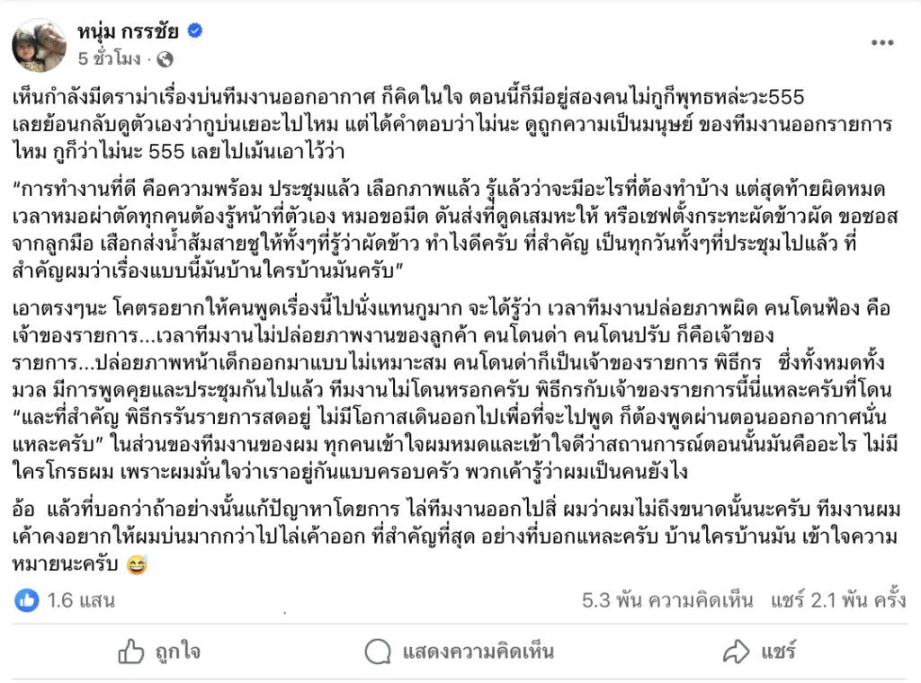 โดย หนุ่ม กรรชัย ได้อธิบายในโพสต์ว่า การทำงานในรายการสดมีความกดดันสูงมาก ความผิดพลาดแม้เพียงเล็กน้อยจากทีมงาน อาจส่งผลเสียกับทั้งรายการ โดยเฉพาะเจ้าของรายการและพิธีกร ที่เป็นคนต้องรับผิดชอบทั้งหมด