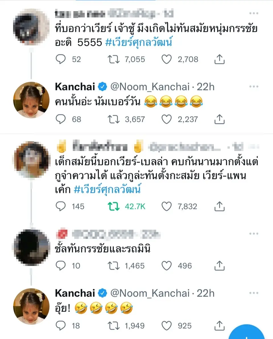 ขณะเดียวกันก็ยังมีอีกผู้ใช้รายหนึ่งออกมาทวีตข้อความไว้อีกว่า เด็กสมัยนี้บอก เวียร์ – เบลล่า คบกันนานมากตั้งแต่กูจำความได้ แล้วกูล่ะทันตั้งกะสมัย เวียร์ – แพนเค้ก #เวียร์ศุกลวัฒน์ ซึ่งก็ได้มีชาวเน็ตรายหนึ่งโผล่ไปคอมเมนต์ว่า ฉันทัน กรรชัย และ รถมินิ ไม่รอช้า หนุ่ม กรรชัย ก็ยังโผล่เข้าไปคอมเมนต์อีกว่า อุ๊ย! ทำเอาเป็นเสียงฮือฮาเฮลั่นกันเต็มในโลกโซเชียลกันยกใหญ่