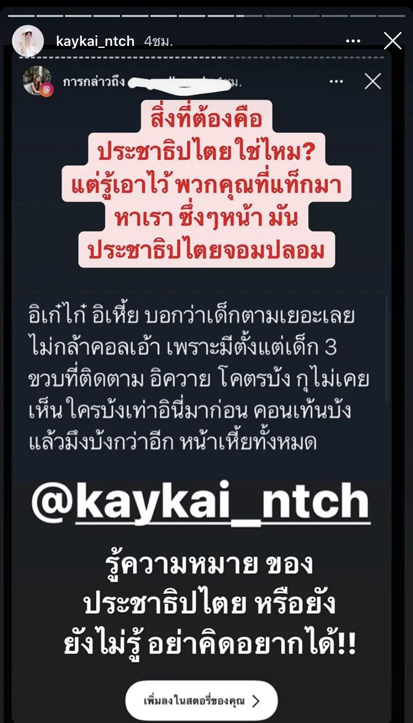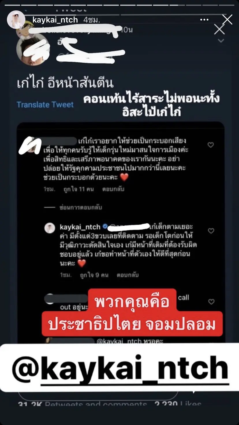 แต่ก็มีประเด็นร้อนที่ชาวเน็ตให้ความสนใจกับกรณีของยูทูบเบอร์ชื่อดังอย่าง เก๋ไก๋ สไลดเดอร์ ก็โดนชาวเน็ตรุมจวกยับ เหตุไม่ยอมออกมาแสดงจุดยืนเมื่อมีคนเข้าไปคอมเมนต์ ว่า “เก๋ไก๋ เราอยากให้ช่วยเป็นกระบอกเสียงเพื่อให้ทุกคนรับรู้ให้เด็กรุ่นใหม่มาสนใจการเมืองค่ะ เพื่อสิทธิและเสรีภาพอนาคตของเรากันนะคะ อย่าปล่อยให้รัฐคุกคามประชาชนไปมากกว่านี้เลยนะคะ ช่วยเป็นกระบอกด้วยนะคะ”