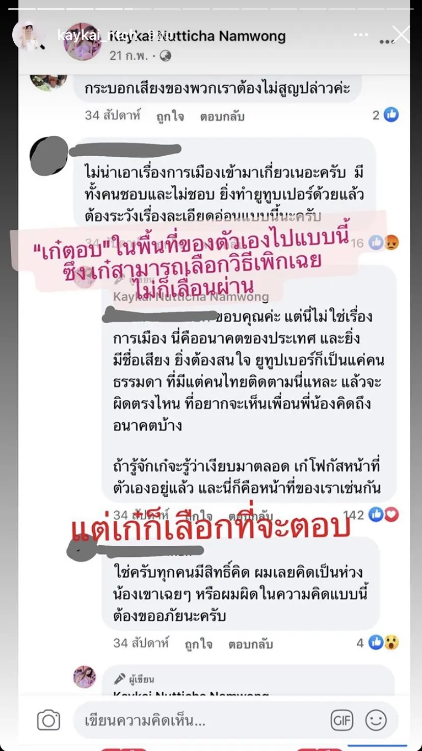 ซึ่งในโพสต์เก่าๆ นั้น ก็มีการบอกว่าคนที่ติดตามเธอมาจะเข้าใจเป็นอย่างดี และก่อนหน้านั้นก็เคยถูกวิจารณ์ทางการเมืองจากอีกฝั่งมาแล้ว
