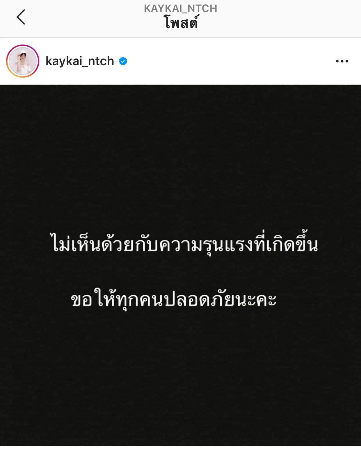 หลังจากนั้นสาวเก๋ไก๋ ได้ออกมาโพสต์ภาพที่มีข้อความว่า “ไม่เห็นด้วยกับความรุนแรงที่เกิดขึ้น และขอให้ทุกคนปลอดภัยนะคะ”