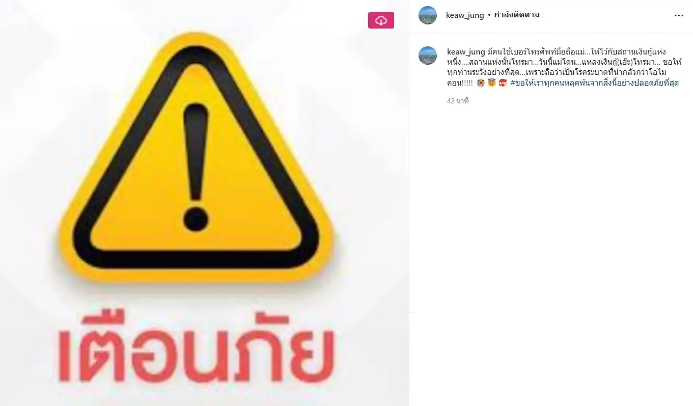 ‘มีคนใช้เบอร์โทรศัพท์มือถือแม่ ให้ไว้กับสถานเงินกู้แห่งหนึ่ง สถานแห่งนั้นโทรมา วันนี้แม่โดน แหล่งเงินกู้ (เอ๊ะ) โทรมา ขอให้ทุกท่านระวังอย่างที่สุด เพราะถือว่าเป็นโรคระบาดที่น่ากลัวกว่าโอไมครอน ขอให้เราทุกคนหลุดพ้นจากสิ่งนี้อย่างปลอดภัยที่สุด’