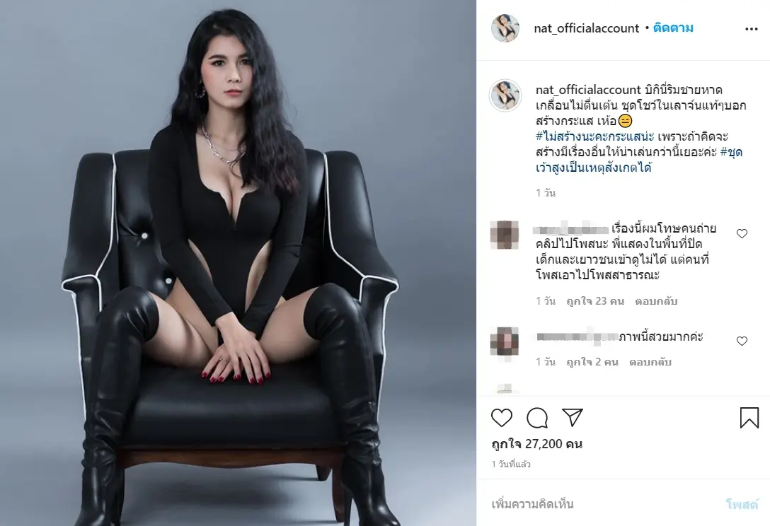 ล่าสุด สาวแนทสุดทน !! ออกมาโพสต์อินสตาแกรมว่า “บิกินี่ริมชายหาดเกลื่อนไม่ตื่นเต้น ชุดโชว์ในเลาจ์นแท้ๆบอกสร้างกระแส เห้อ?ไม่สร้างนะคะกระแสน่ะ เพราะถ้าคิดจะสร้างมีเรื่องอื่นให้น่าเล่นกว่านี้เยอะค่ะ #ชุดเว้าสูงเป็นเหตุสังเกตได้” เรียกได้ว่า ก็เป็นชุดที่ไม่ได้เกินเหตุ เพราะงานก็คืองาน ส่วนชีวิตส่วนตัวของแนท ก็สวมใส่เสื้อผ้าสบายๆ เข้าวัดทำบุญตามปกตินั้นแหละค่าาา