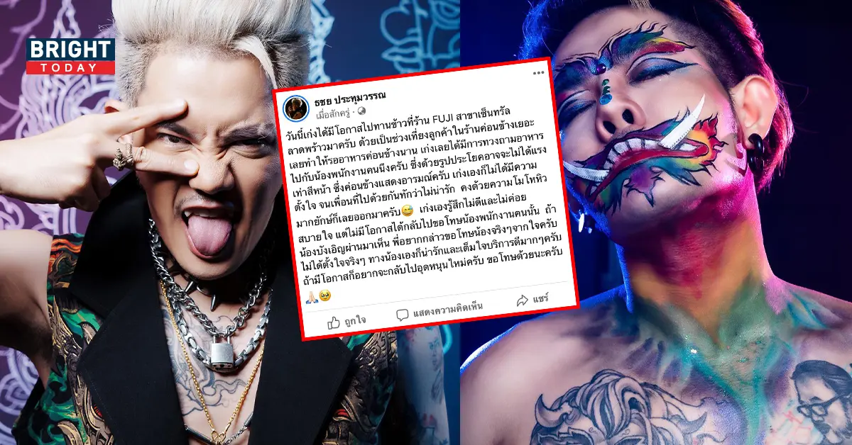 ยังไม่ทันดราม่าเจ้าตัวออกมาโพสต์ร่ายยาวขอโทษก่อนทันทีสำหรับนักร้องหนุ่ม เก่ง ธชย หลังเจ้าตัวไปทานอาหารร้านดัง ก่อนมีกาชักสีหน้าใส่พนักงานเสิร์ฟ ยอมรับว่ารู้สึกไม่ดี และไม่สบายใจ พร้อมร่ายข้อความว่า