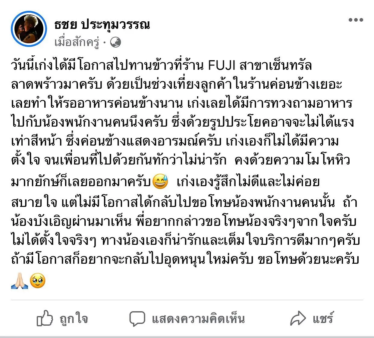 เก่ง ธชย โพสต์ร่ายยาวขอโทษ สำนึกผิดหลังชักสีหน้าพนักงานเสิร์ฟร้านอาหารดัง สาเหตุมาจากความหิว ยอมรับรู้สึกไม่ดี และไม่ค่อยสบายใจ