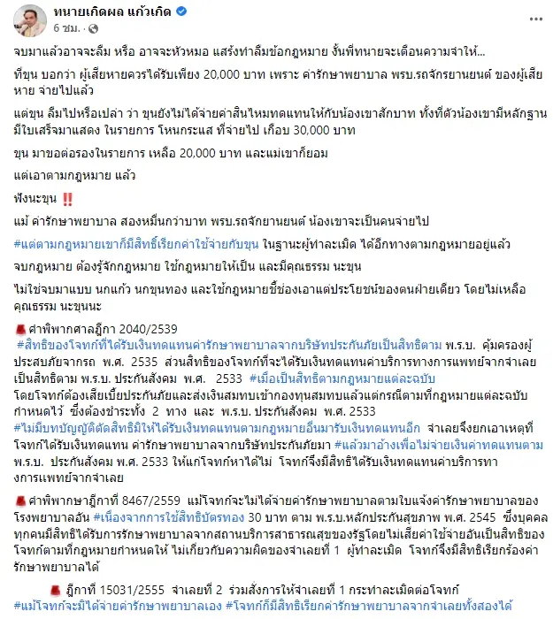 ทนายเกิดผล โพสต์เฟซบุ๊กจวก ขุน ชานนท์ อาจหัวหมอ แสร้งทำลืมข้อกฎหมาย ปมต่อรองเงินชดเชยขับรถชนเหยื่อจนแขนหัก