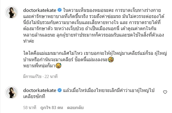 หนึ่งในคนที่ชื่อเสียงที่ออกมาพูดประเด็นอย่าง หมอของขวัญ ก็ได้โพสต์ข้อความทางไอจีของตัวเอง ถึงประเด็นที่มีการต่อรองเรื่องของเงินเยียวยาว่าในความเห็นของหมอ มันไม่ควรจะต่อรองได้ นี่ยังไม่นับรวมถึงเรื่องความบาดเจ็บและความเสียหายทางใจ และการขาดรายได้ที่ต้องมารักษาตัว กรณีแบบนี้ถ้าหากเป็นเมืองนอก คูณค่าตกใจกันหลายล้านบาทเลย เป็นลูกผู้ชายทำประมาทก็ควรยอมรับผิดและชดใช้ในสิ่งที่ตัวเองทำ