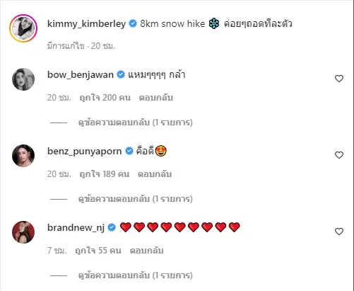 เห็นแบบนี้ ก็มีเพื่อน ๆ เข้ามาแซวเจ้าตัวกันอย่างใหญ่ ทั้งโบว์ เบญจวรรณ , เบ็นซ์ ปุณยาพร และ นิว นภัสสร รวมถึงแฟน ๆ ที่เข้ามาให้กำลังใจเจ้าตัวก็การเดิยไฮกิ้งในครั้งนี้ด้วย เล่นทำเอาหน้าแดงจมูกแดงเลยทีเดียว