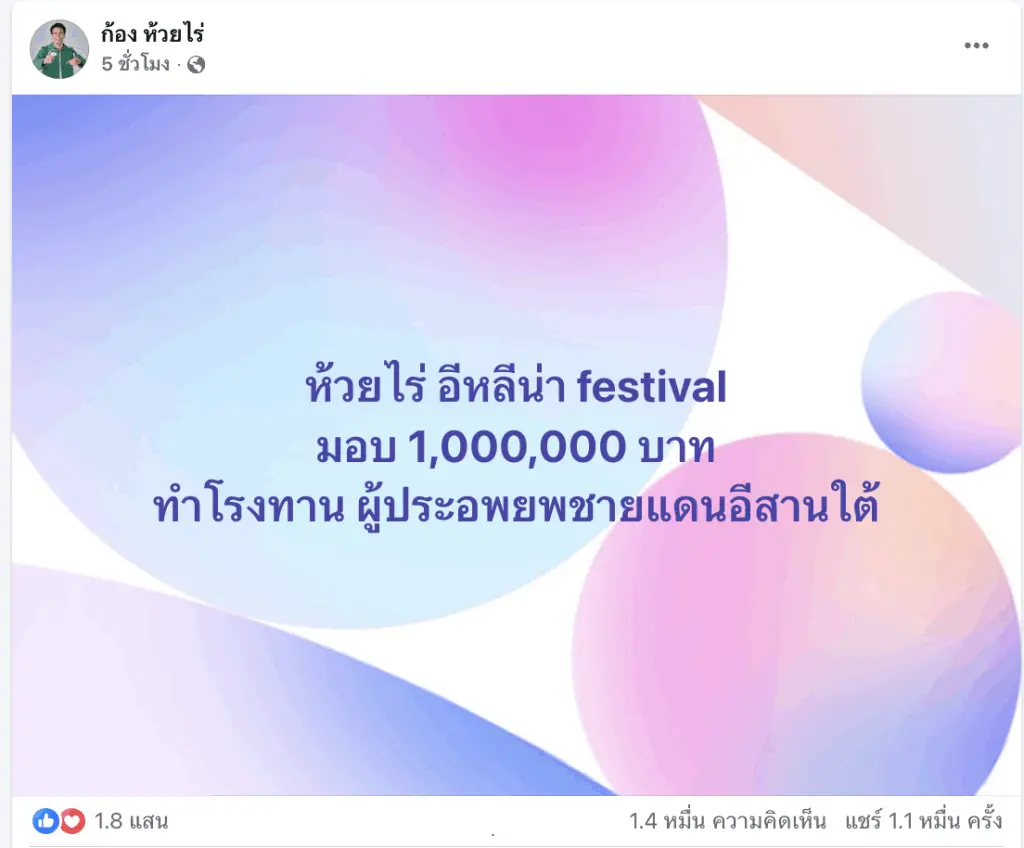 “ห้วยไร่ อีหลีน่า festival มอบ 1,000,000 บาท ทำโรงทาน ผู้ประสบภัยชายแดนอีสานใต้”