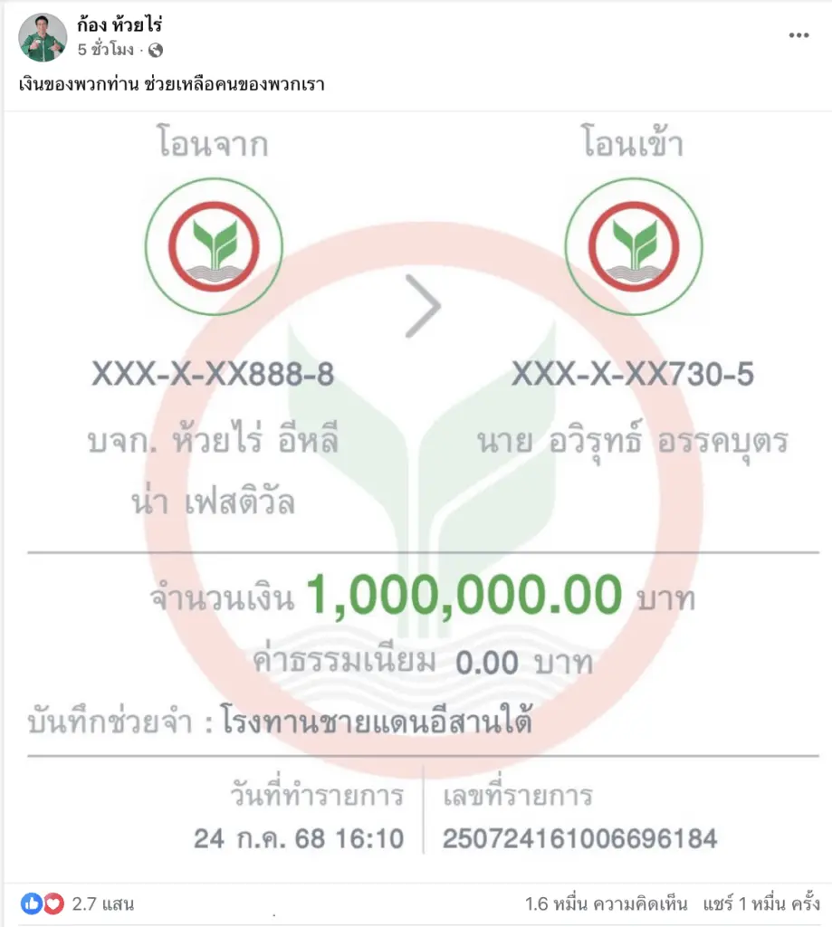 โดยก้องได้โพสต์ข้อความผ่านโซเชียล พร้อมแนบสลิปการโอนเงิน และระบุข้อความว่า: