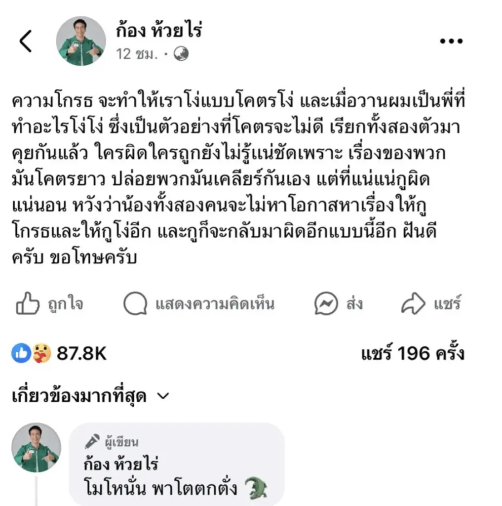 ล่าสุด ก้อง ห้วยไร่ ได้ออกมาโพสต์ขอโทษอย่างเป็นทางการ โดยยอมรับว่าตนเองทำพฤติกรรมที่ไม่เหมาะสมเพราะอารมณ์ชั่ววูบ พร้อมระบุว่า