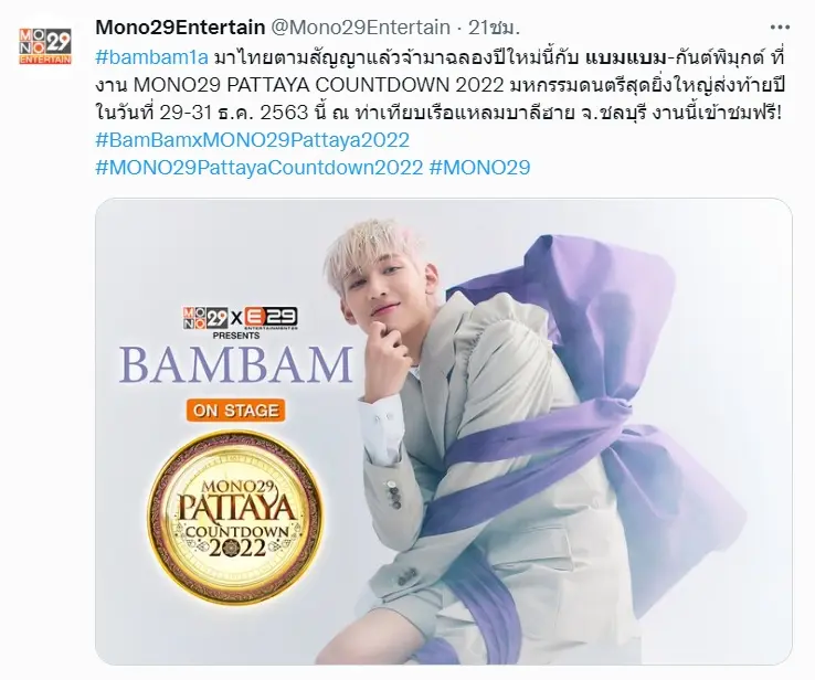 ทำเอาแฟนๆ ฮือฮาเป็นอย่างมาก เมื่อไอดอลเกาหลีสัญชาติไทย “แบมแบม กันต์พิมุกต์” ได้ประกาศเข้าร่วมงานเคาท์ดาวน์ “Mono29 Pattaya Countdown 2022” มหกรรมดนตรีสุดยิ่งใหญ่ส่งท้ายปี ในวันที่ 29-31 ธ.ค. 2564 นี้ ณ ท่าเทียบเรือแหลมบาลีฮาย จ.ชลบุรี แถมงานนี้ยังเข้าชมฟรีอีกด้วย !