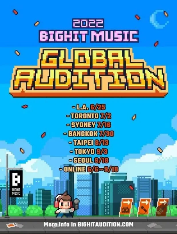 Big Hit Music ประกาศว่าจะจัด “2022 Big Hit Music Global Audition” ทางออนไลน์และออฟไลน์ตั้งแต่วันนี้ ถึง 18 กันยายน โดยไม่คำนึงถึงสัญชาติหรือถิ่นที่อยู่ หนุ่มๆที่เกิดหลังปี 2002 สามารถเข้าร่วมได้ และผู้เข้าร่วมสามารถเลือกการร้อง แร็พ เต้น หรือสาขาอื่นๆ ที่สามารถแสดงศักยภาพในการเป็นศิลปินของตนเองได้อย่างเต็มที่