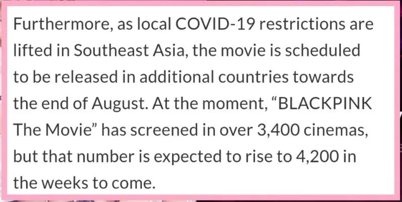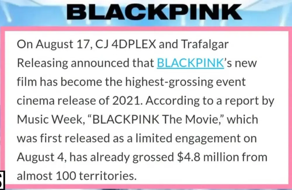 ตามรายงานของ music week ‘The Movie’ ของ Blackpink ซึ่งเปิดตัวครั้งแรกในวันที่ 4 สิงหาคม ทำรายได้ 4.8 ล้านดอลลาร์จากเกือบ 100 เขต