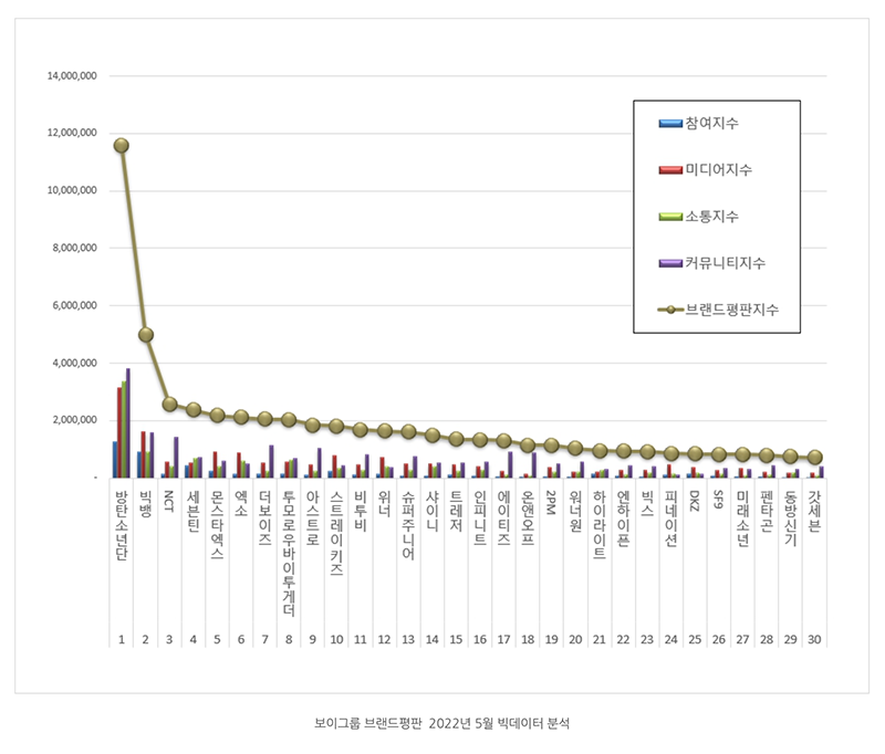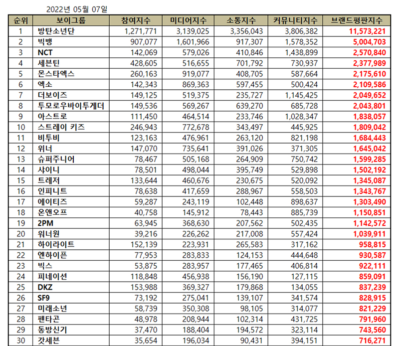 เพื่อหาคำตอบ สถาบัน Korea Institute of Corporate Reputation ได้วิเคราะห์ข้อมูลขนาดใหญ่ของบอยแบนด์ K-Pop ในปัจจุบัน โดยรวบรวมตั้งแต่วันที่ 7 เมษายน ถึง 7 พฤษภาคม 2022 โดยการวิเคราะห์นี้ได้พิจารณาข้อมูลจากพื้นที่ต่างๆ รวมถึงการมีส่วนร่วมของผู้บริโภค ไปจนถึงกิจกรรมสื่อ การสื่อสาร ชุมชน กิจกรรม ฯลฯ