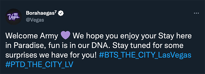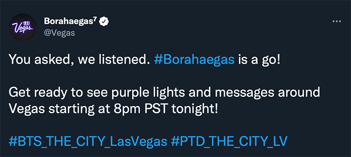 แค่นั้นยังไม่พอ บัญชี Twitter อย่างเป็นทางการของ @Vegas ยังได้เปลี่ยนชื่อเป็น @Borahaegas⁷ นอกจากนี้ ทางเมืองยังได้ประสานงานกับทุกรีสอร์ทเพื่อจุดไฟกระโจม ไฟ LED ให้เป็นสีม่วงทั้งหมด ก่อนการแสดง ‘PTD on Stage – LV’ ครั้งแรกในวันศุกร์ที่ 8 เมษายนจะเริ่มขึ้น!