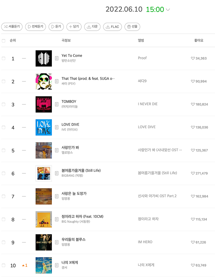ประมาณหนึ่งชั่วโมงหลังจากการเปิดตัวทั่วโลก เพลงไตเติ้ลคัมแบ็คของ BTS “Yet To Come (The Most Beautiful Moment)” ได้ขึ้นอันดับ 1 ในชาร์ต Top 100 ของ Melon