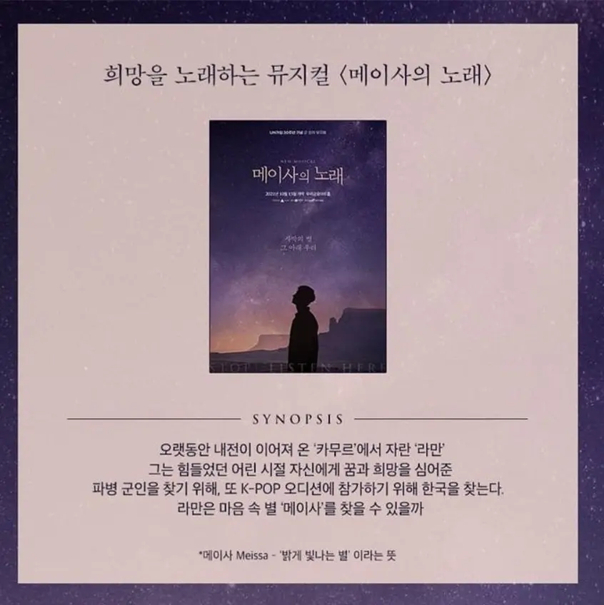 “The Meissa’s song” เป็นเรื่องราวที่เกิดขึ้นในระหว่าง 2 เมืองที่มีความต่างทางวัฒนธรรมกันอย่างสิ้นเชิง โดยเป็นเรื่องราวระหว่างเมืองในจินตนาการอย่าง Kamur ที่มีเหตุการณ์สงครามกลางเมืองเกิดขึ้นมาอย่างยาวนาน และประเทศเกาหลี ที่มีการจัดออดิชันสำหรับ k-pop โดยเรื่องนี้จะเล่าเกี่ยวกับ ‘Raman’ ชายหนุ่มที่เกิดและเติบโตในเมือง Kamur ซึ่งเขาถูกส่งตัวมายังเกาหลีเพื่อตามหา ‘Meissa’ ทหารประจำการที่จุดประกายความฝันและความหวังให้กับเขา