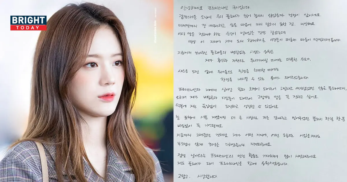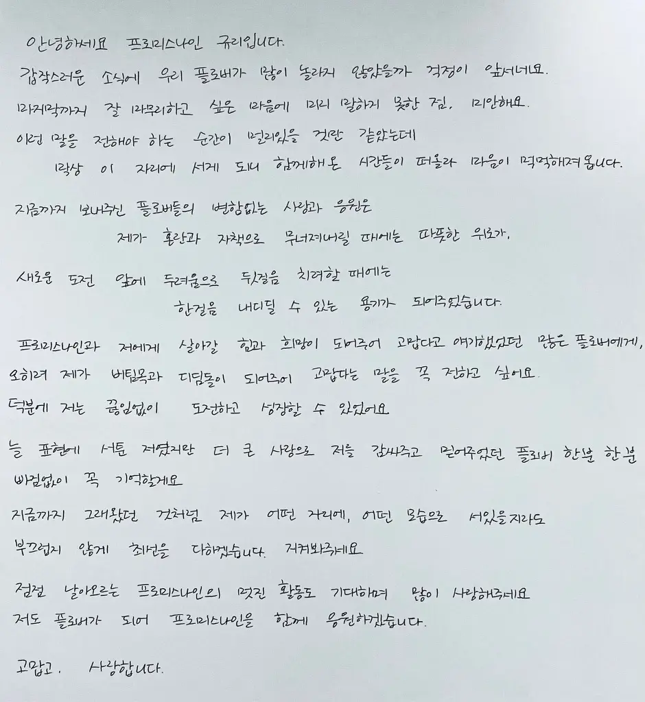 จางกยูริ fromis_9 ได้แชร์จดหมายที่เขียนด้วยลายมือถึงแฟนๆหลังจากมีประกาศว่าเธอจะออกจากวง หลังหมดสัญญากับต้นสังกัด