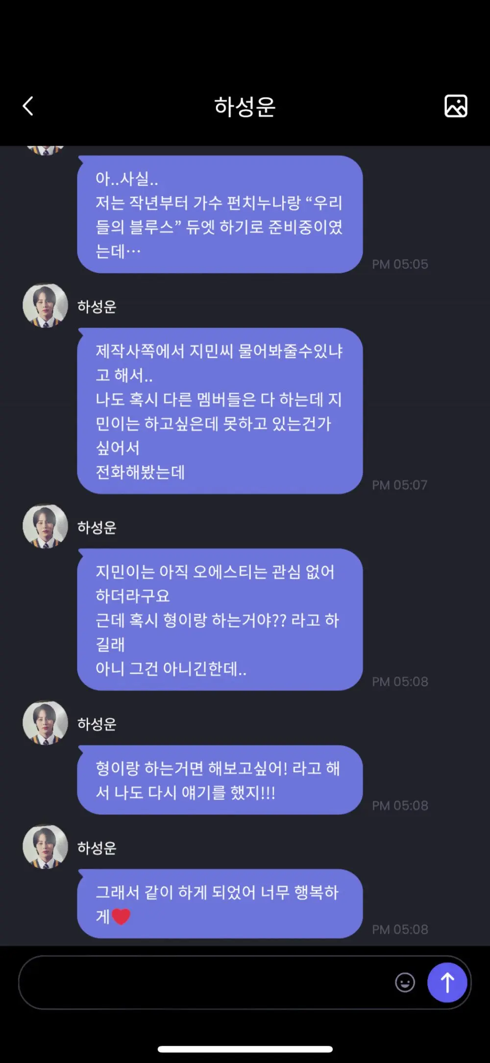 “อ่า… จริงๆ แล้ว.. ตั้งแต่ปีที่แล้ว ผมได้ทำงานในเพลงประกอบละครคู่กับ Punch สำหรับ ‘Our Blues’… แล้วบริษัทผลิตเพลงประกอบละครก็ถามผมว่า ผมจะสามารถติดต่อจีมินให้พวกเขาได้ไหม… และผมก็อยากรู้เหมือนกัน เลยโทรไปถามเขาว่าสนใจร้องเพลงประกอบละครไหม เพราะสมาชิกคนอื่น ๆ ก็เคยปล่อยเพลงประกอบละครหมดแล้ว แต่เขาบอกว่า เขาไม่ได้สนใจร้องเพลงประกอบละคร แต่แล้วเขาก็แบบ ‘เป็นเพลงคู่กับนายหรือเปล่า’ และผมก็พูดว่า ‘ฉันว่าไม่นะ’ แต่เขาพูดว่า ‘ถ้าเป็นเพลงคู่กับนาย ฉันอยากลองดู’ ผมก็เลยส่งต่อข้อความของเขาไปยังบริษัทโปรดักชั่น!!! และนั่นคือวิธีที่ทำให้เราได้ทำงานด้วยกัน และผมก็มีความสุขมาก”