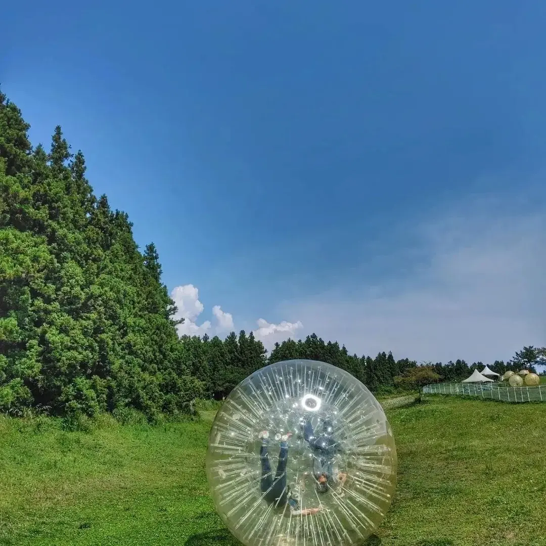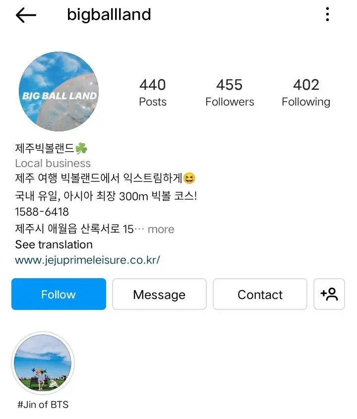 ‘Big Ball Land’ เป็นสถานที่ท่องเที่ยวบนเกาะเชจู กิจกรรมเด่นคือให้ผู้คนเข้าไปในลูกบอลใสขนาดใหญ่และกลิ้งลงเขา! เราไม่รู้แน่ชัดว่าจินเข้าไปอยู่ในลูกบอลขนาดใหญ่เหล่านั้นด้วยหรือเพียงแค่ถ่ายภาพเฉยๆ อย่างไรก็ตาม ภาพถ่ายนี้ส่งผลกระทบเป็นอย่างมาก!