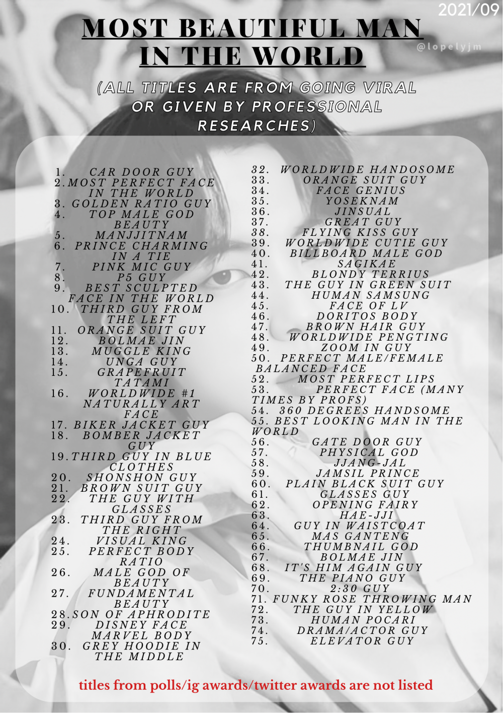 อีกชื่อเล่นยอดนิยมของจินในเกาหลีคือ “บุตรแห่งอโฟรไดท์” ริมฝีปากอวบอิ่มสีชมพู แก้มแดงอมชมพู ดวงตาเปล่งประกาย บางคนที่เข้าร่วมคอนเสิร์ตบอกว่าภาพลักษณ์อันงดงามและการปรากฏตัวของจินให้ความรู้สึกเหมือนอยู่ในการ์ตูนดิสนีย์