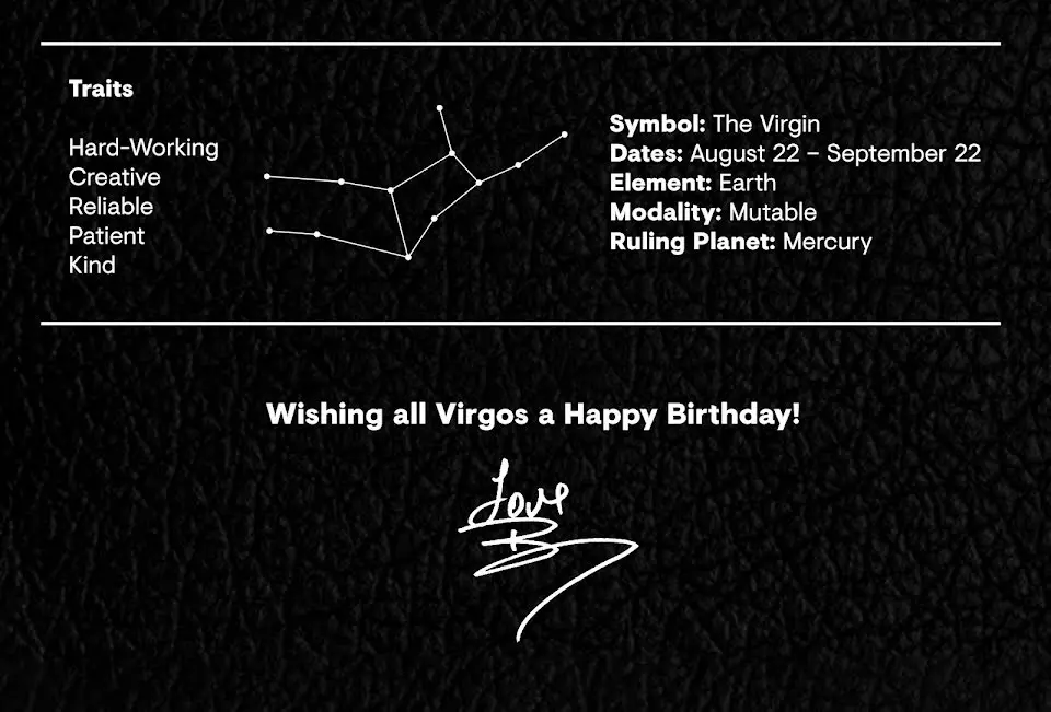 ในหนังสือรุ่น Beyoncé อธิบายว่า Virgos หรือ ราศีกันต์ ทำงานหนัก สร้างสรรค์ เชื่อถือได้ อดทน และใจดี ซึ่งทั้งหมดนี้อธิบายตัวตนของ จองกุก ได้อย่างสมบูรณ์แบบ เธออวยพรวันเกิดให้กับชาวราศีกันย์ในข้อความ