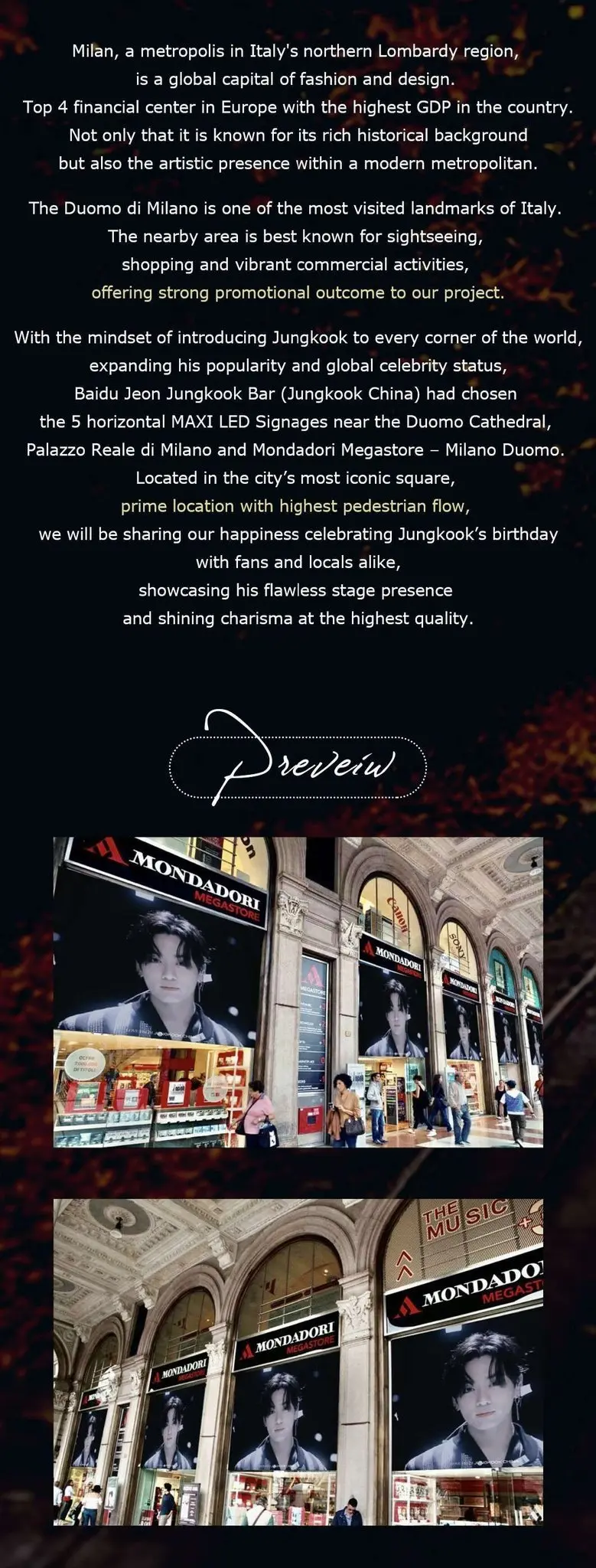 จองกุกจะได้รับการโปรโมทใกล้กับมหาวิหารดูโอโม, ปาลาซโซ เรอาเล ดิ มิลาโน และมอนดาโดรี เมก้าสโตร์ – มิลาโน ดูโอโม ซึ่งตั้งอยู่ในจตุรัสที่โดดเด่นที่สุดของเมือง ด้วยทำเลที่ดีเยี่ยมและทางเดินเท้าที่สูงที่สุด แสดงให้เห็นถึงการแสดงบนเวทีอันไร้ที่ติของจองกุกด้วยคุณภาพสูงสุด