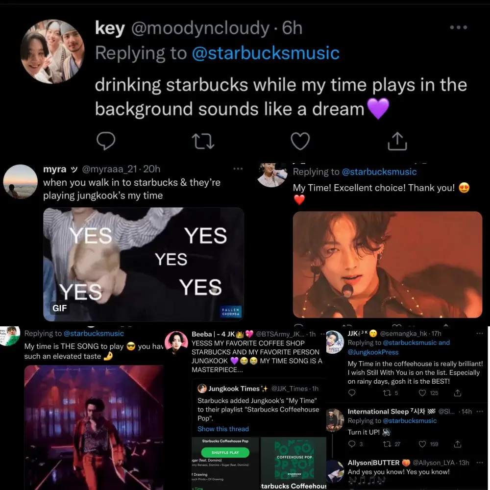 เพลงเดี่ยว จองกุก BTS ที่มีชื่อว่า ” My Time” ถูกเพิ่มลงในเพลย์ลิสต์ “Starbucks Coffeehouse Pop” บน Spotify ซึ่งเป็นเพลงเดี่ยวของ BTS เพลงเดียวในเพลย์ลิสต์ ” My Time” ผลงานเพลง R&B ที่เขียน เรียบเรียง และร้องโดยจองกุก ได้รับความนิยมอย่างมากในหมู่แฟน ๆ และประชาชนทั่วไปทั่วโลกนับตั้งแต่เปิดตัวในปี 2020