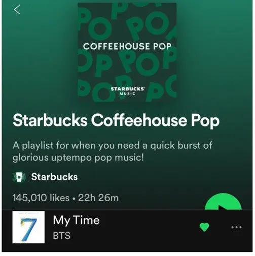 Starbucks เพิ่มเพลงโซโล่ “My Time” ของจองกุก BTS ลงในเพลย์ลิสต์ “Starbucks Coffeehouse Pop” บน Spotify ทำเอาแฟนๆของจองกุกตื่นตื่นยกใหญ่