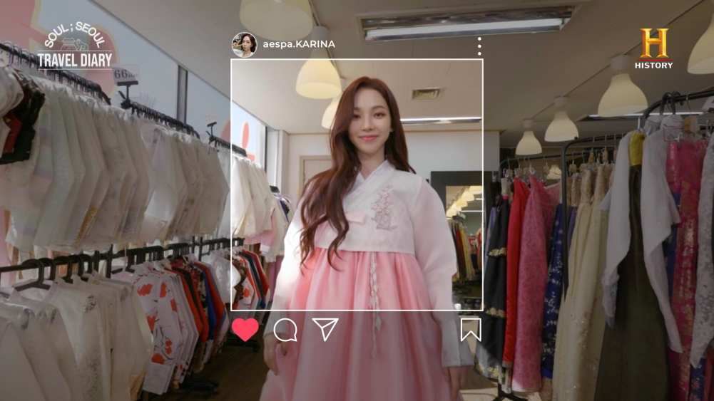 นอกจากนี้ คาริน่า ยังพาแฟนๆ ของเธอไปยังสถานที่ที่พวกเขาสามารถสัมผัสประวัติศาสตร์ของเกาหลีได้อย่างเต็มที่ ร้านเช่าชุดฮันบกแบบดั้งเดิม เธอเล่าว่าผู้เยี่ยมชมพระราชวังสามารถเช่าชุดเกาหลีแบบดั้งเดิมที่สวยงามเหล่านี้และเดินไปรอบ ๆ วังเพื่อซึมซับประวัติศาสตร์ได้อย่างสมบูรณ์