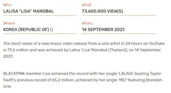 เมื่อวันที่ 8 ตุลาคม Guness World Records ได้ประกาศบนเว็บไซต์ว่ามิวสิควิดีโอ “LALISA” ของ ลิซ่า BLACKPINK เป็นมิวสิควิดีโอ YouTube ที่มีผู้ชมมากที่สุดใน 24 ชั่วโมง โดยมิวสิควิดีโอเพลง “LALISA” มียอดวิวถึง 73.6 ล้านครั้งบน YouTube ภายในวันเดียวที่ปล่อยออกมา