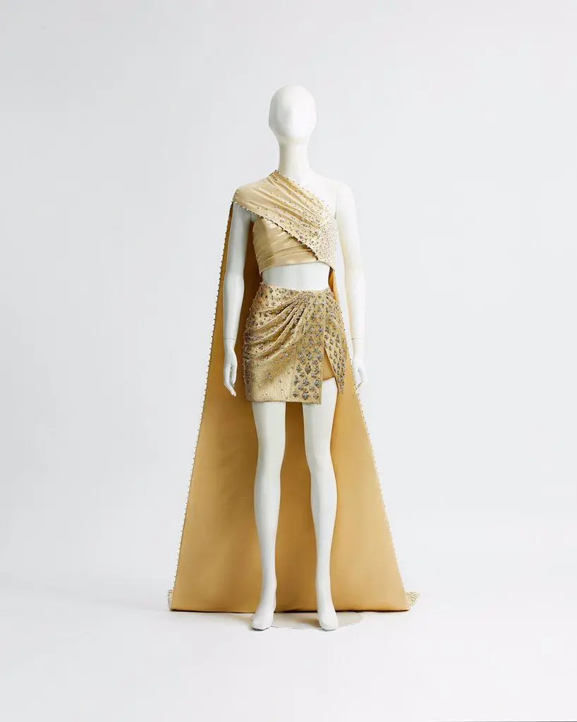 ต้องบอกว่าไม่ธรรมดาจริงๆ เพราะชุดนี้ตัดเย็บจากผ้าไหมไทยยกลำพูนลายพานจักรพรรดิยกทอง ประดับด้วยคริสตัลจาก Swarovski สะท้อนเอกลักษณ์ความเป็นไทย สร้างความโดดเด่นสะดุดตาไปทั่วโลก