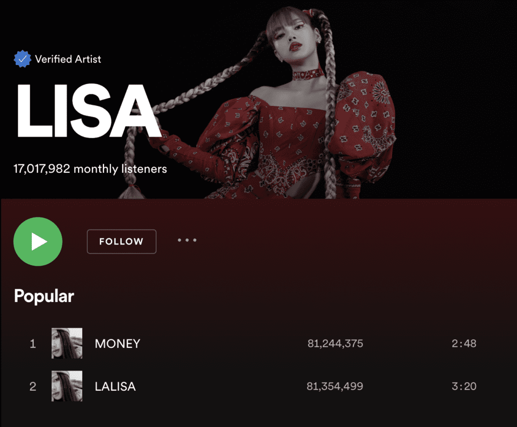 นอกจากนี้ MONEY และ LALISA ยังผลัดกันเป็นเพลงเดี่ยวของศิลปิน K-pop ที่มีการสตรีมมากที่สุดใน Spotify Global Daily Chart