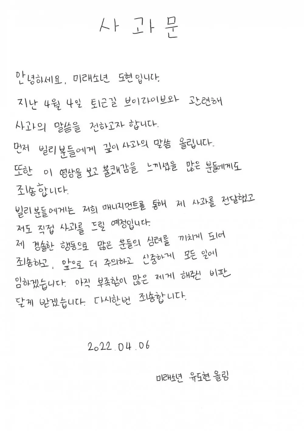 ผมได้แสดงความขอโทษต่อสมาชิก Billlie ผ่านทางค่ายเพลงของผม และผมก็วางแผนที่จะขอโทษเป็นการส่วนตัวด้วย