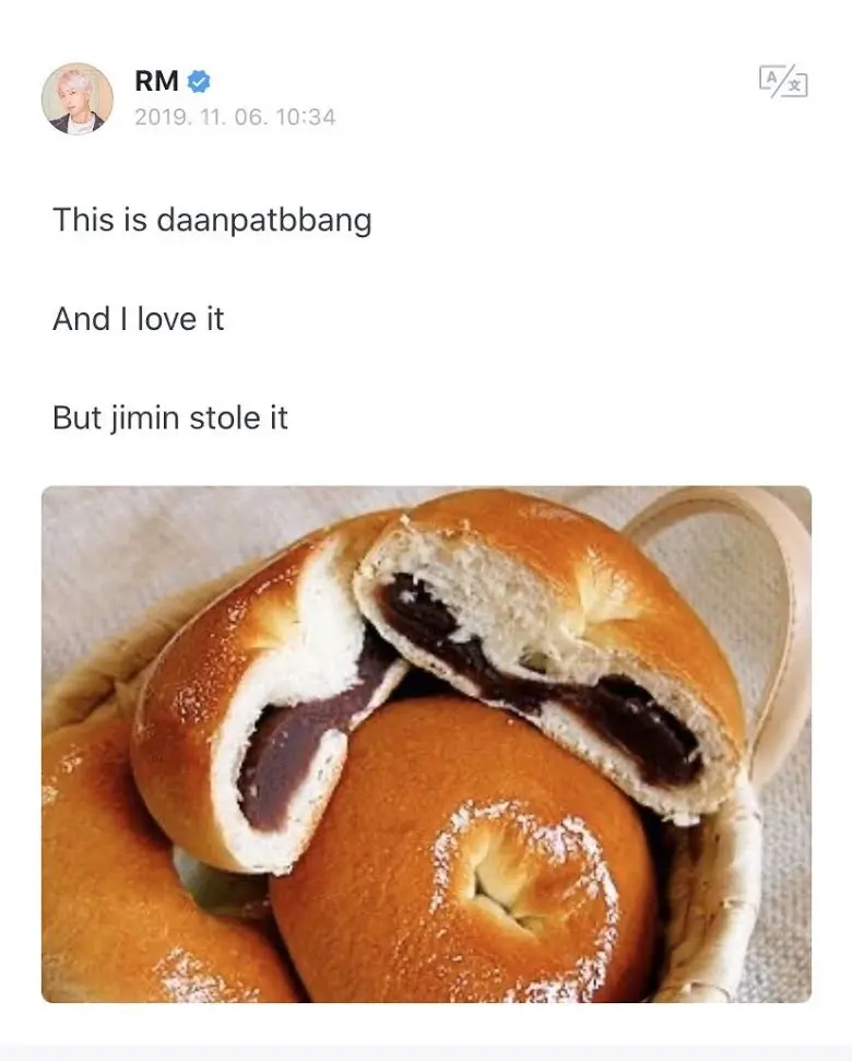 เขาตอบกลับเป็นภาษาอังกฤษว่า “เพราะจีมินขโมยDaanpatbbangของฉันไป” Daanpatbbang คือขนมปังถั่วแดง