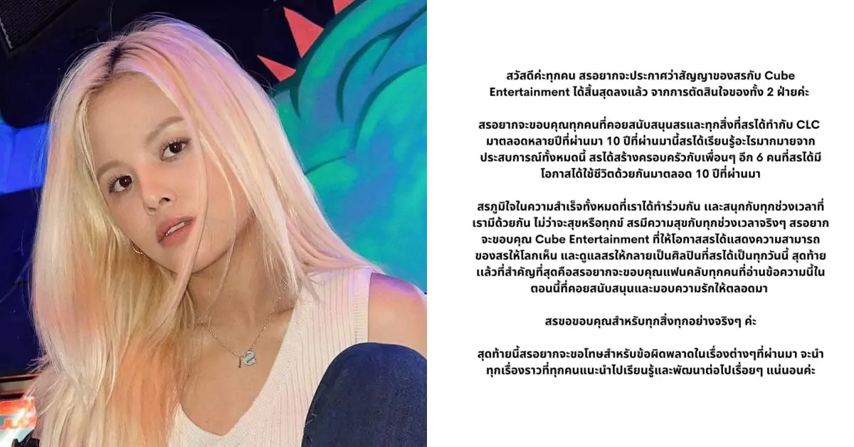 ต้นสังกัดออกแถลงการณ์ “สร” สมาชิกชาวไทยจากวง CLC ตัดสินใจออกจากวง และ Cube Entertainment คาดโดนบอกเลิกสัญญา