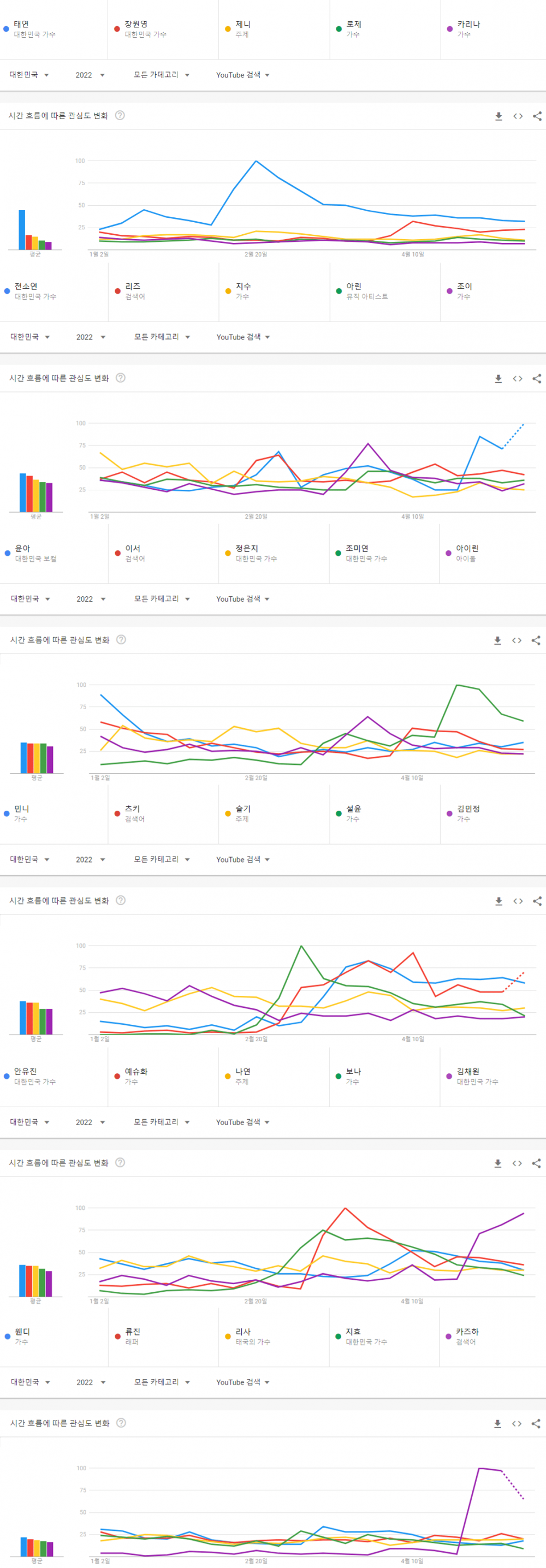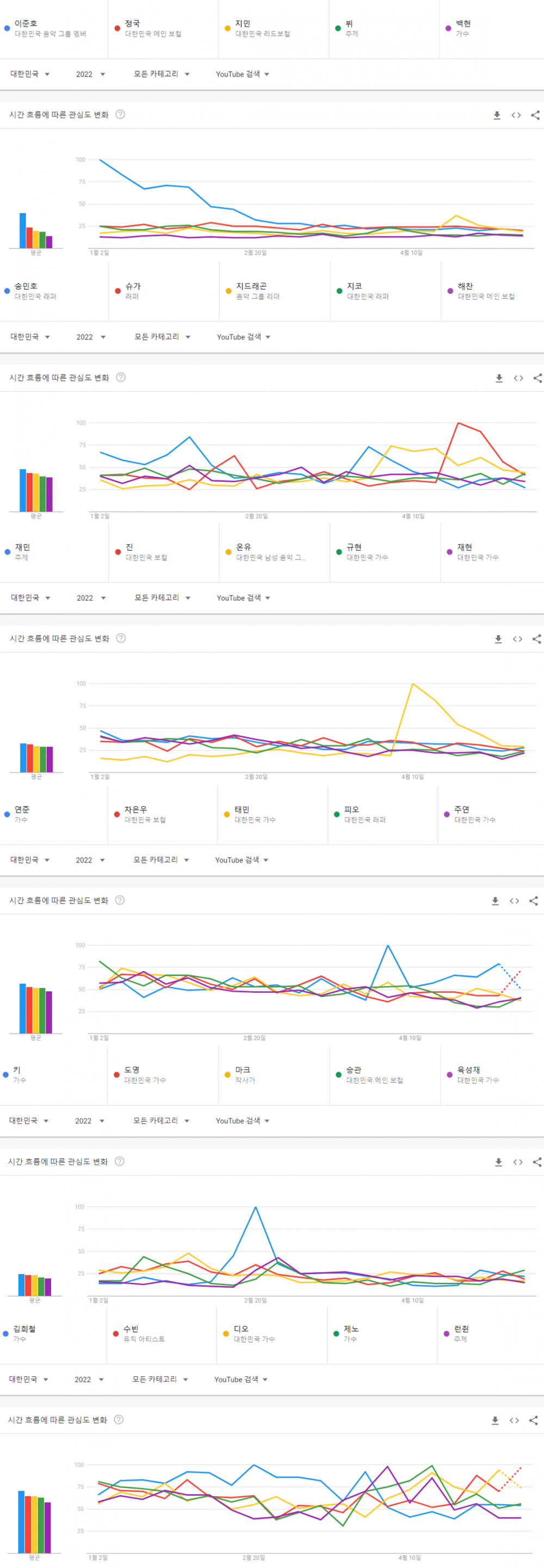 ตามข้อมูลที่รวบรวมตั้งแต่วันที่ 1 มกราคม 2022 ถึง 22 พฤษภาคม 2022 จุนโฮ 2PM และแทยอน Girls’ Generation เป็นไอดอลชายและหญิงที่มีการค้นหามากที่สุดบน YouTube ในเกาหลี